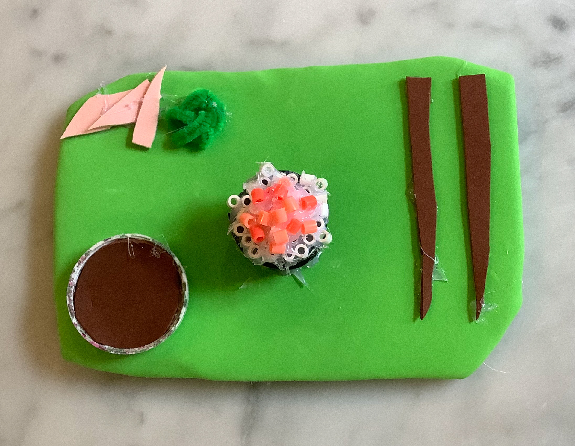 this project is good enough to eat! in this work Ashi tried to make a sushi meal with all the elements, chop sticks, ginger, soy sauce, wasabi, and a sushi roll! all using materials around her house to make it.